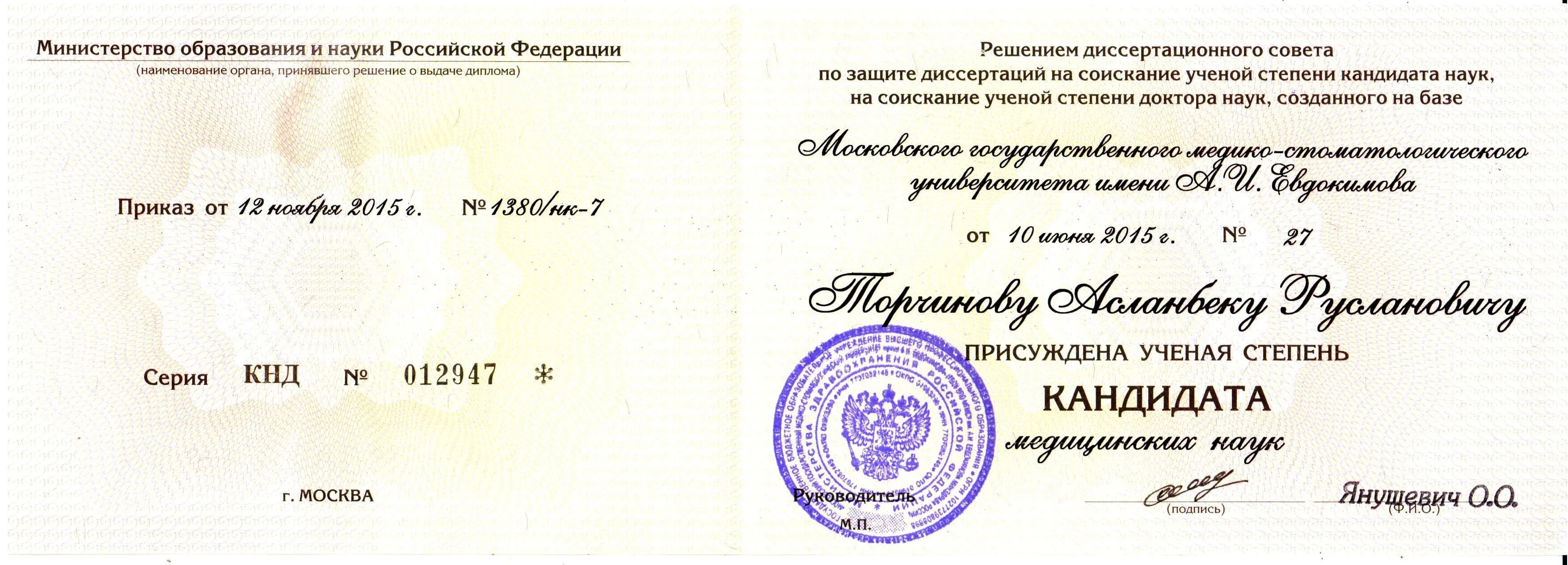 - Кандидат медицинских наук;