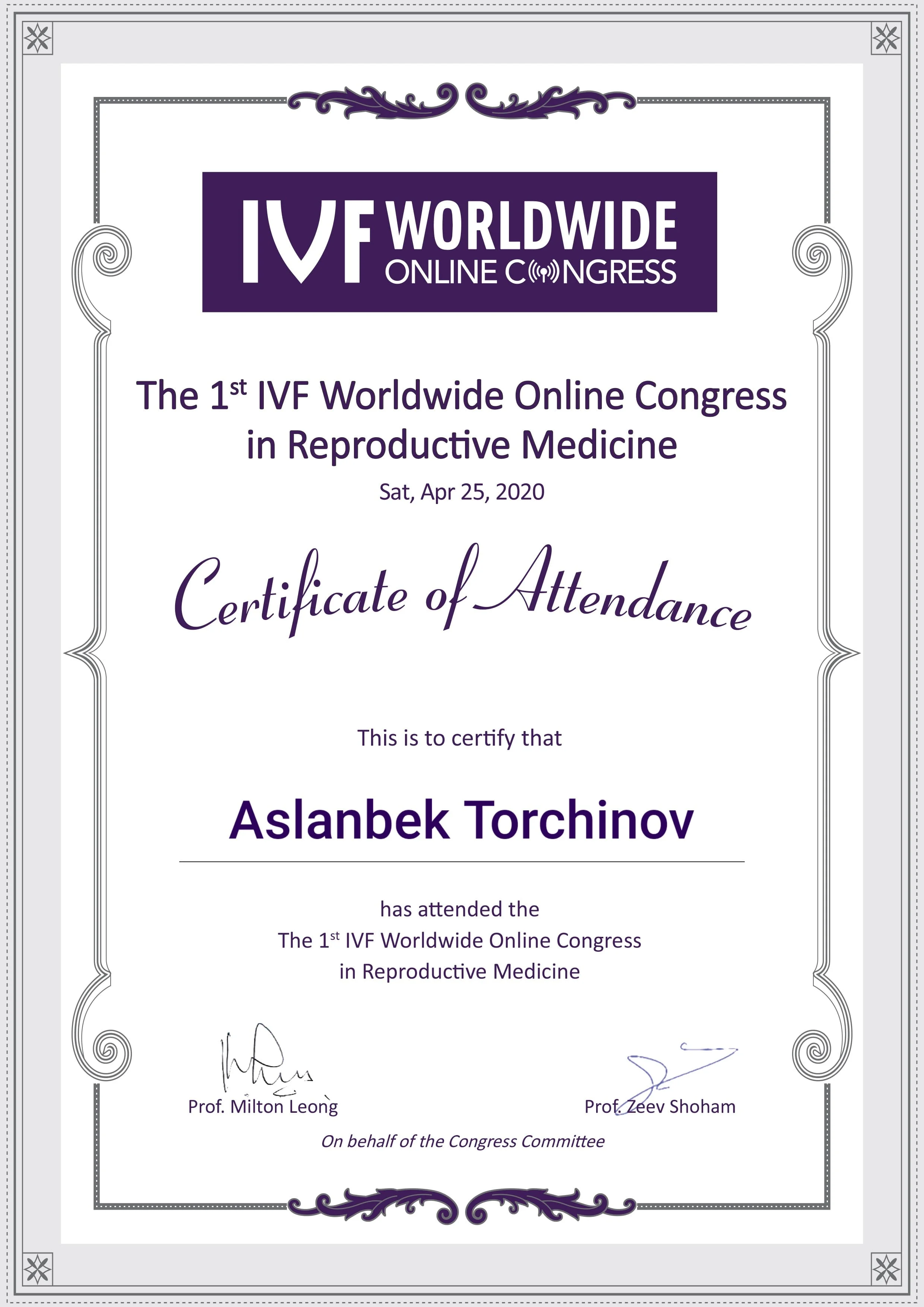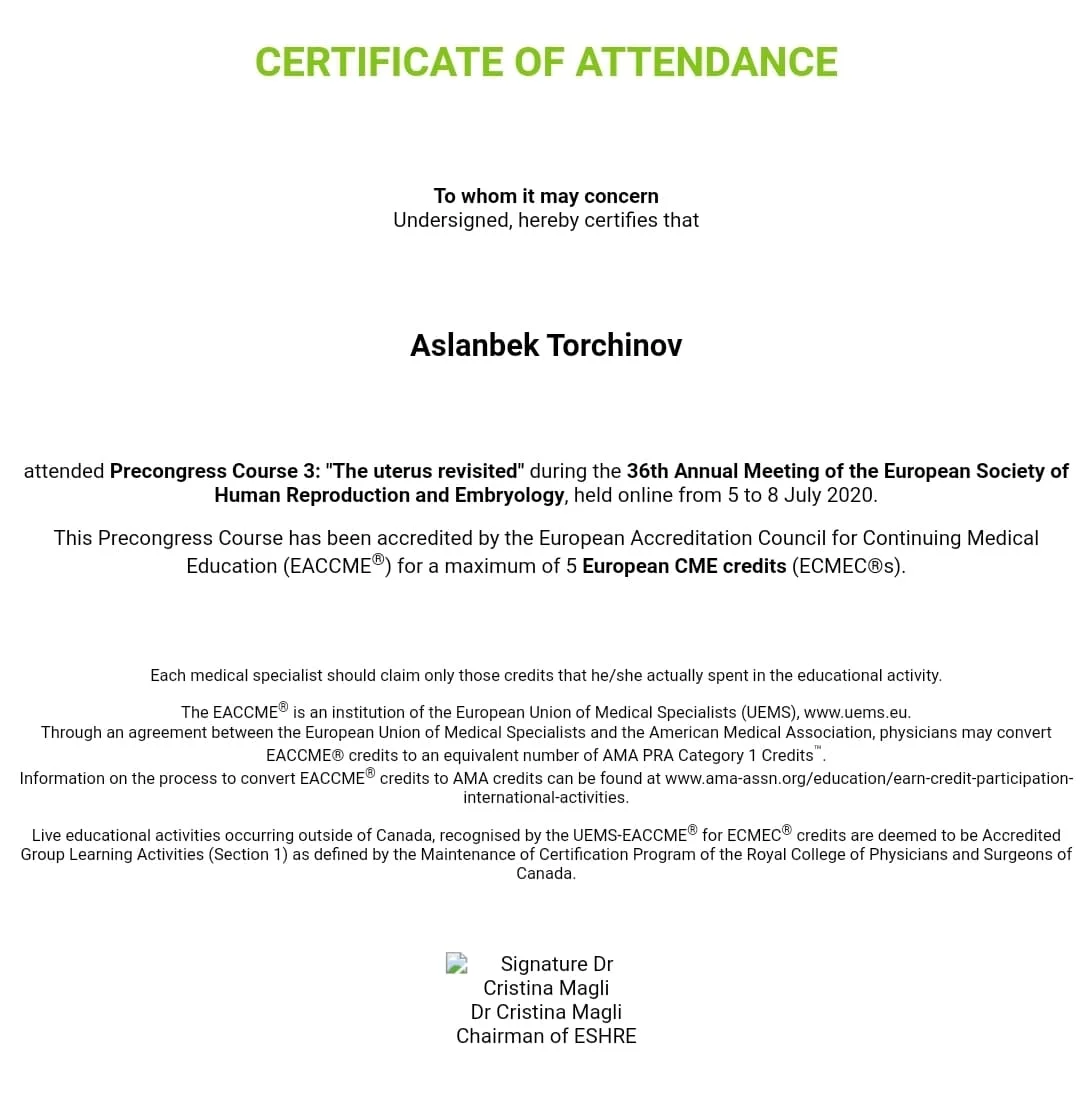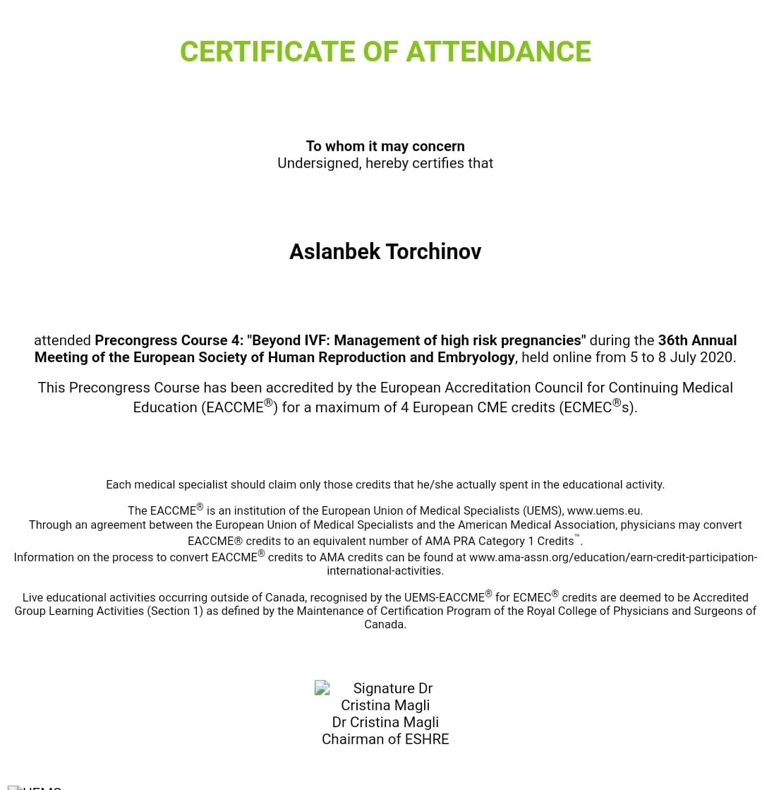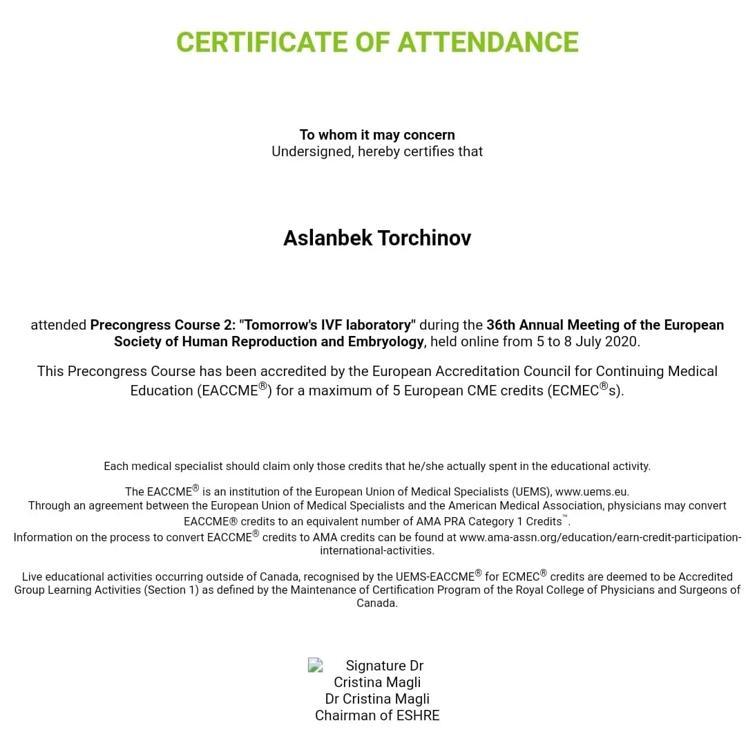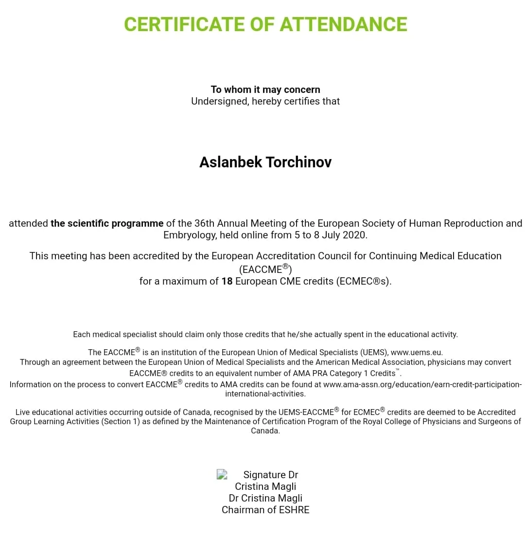 - Член Европейского Общества Репродукции Человека и Эмбриологии (ESHRE);
